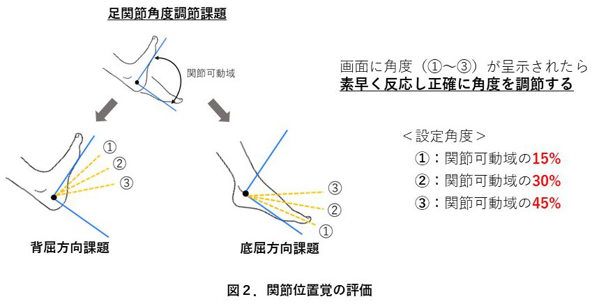 続いて,感覚機能を調べるために,刺激を感じ取る能力(閾値)と関節位置覚を測定しました.関節位置覚は,足関節を決められた角度に素早く正確に再現する課題を行い,設定された角度と再現した角度との誤差で評価しました(図2).