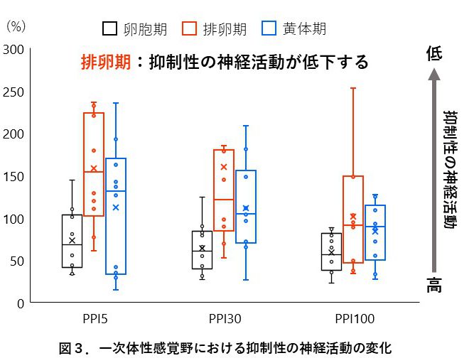 その結果,排卵期に一次体性感覚野の抑制性ニューロンの働きが低下することが分かり,月経周期は,一次体性感覚野の活動を変化させることが明らかとなりました(図3).