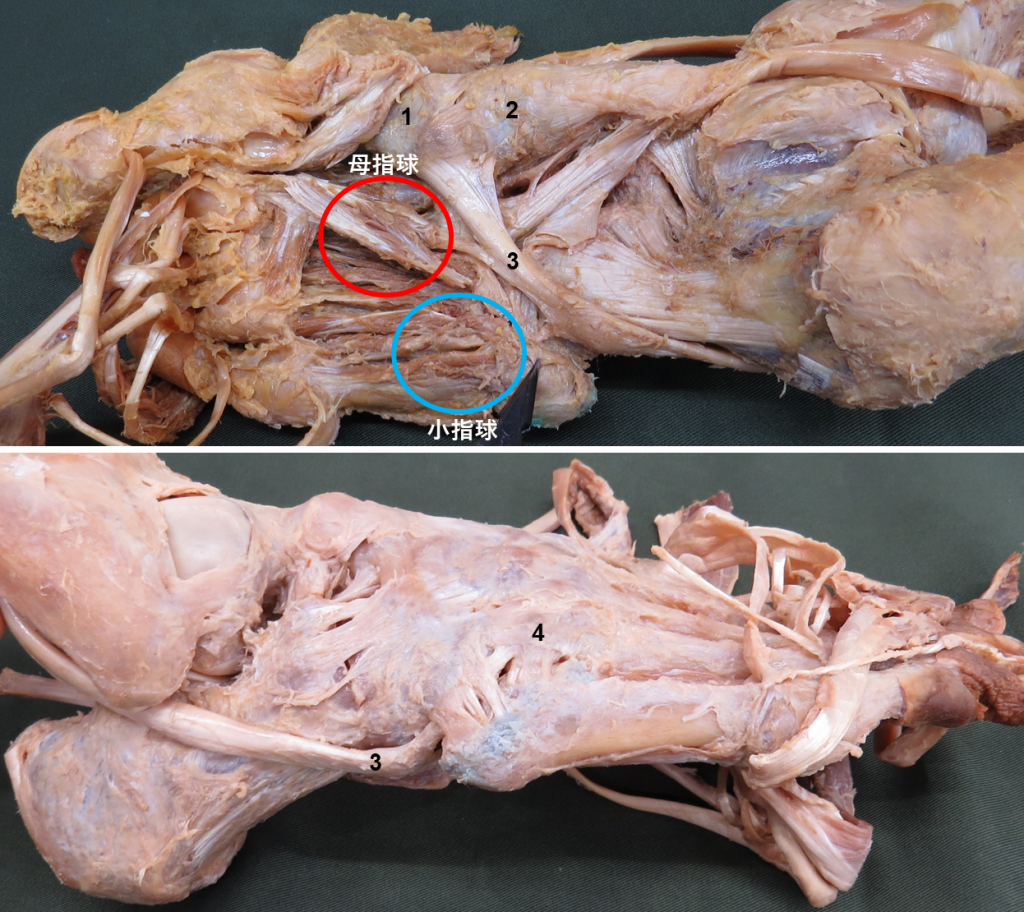 1:第1中足骨,2:内側楔状骨,3:長腓骨筋,4:第4中足骨