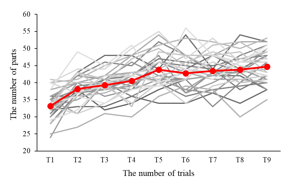 ② 各被験者が遂行した計9回のPPTの成績は,回数を重ねるにつれて増加していく結果となりました.