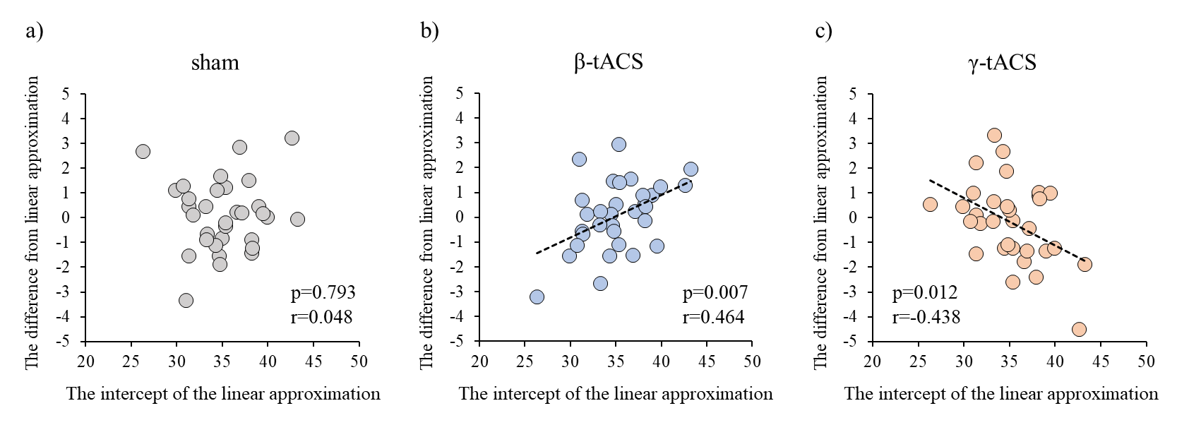 ③ 各被験者が遂行した9回のPPTのパーツ数の近似直線を算出しました.また近似直線と実際に遂行したパーツ数との差を算出し,刺激による成績変化量の指標としました.さらに近似直線の切片の値をベースライン成績の指標としました.β-tACS条件では成績変化量とベースライン成績との間に有意な正の相関が認められ(p = 0.007,Pearson’s r = 0.464),γ-tACS条件では有意な負の相関が認められました(p = 0.012,Pearson’s r = -0.438).