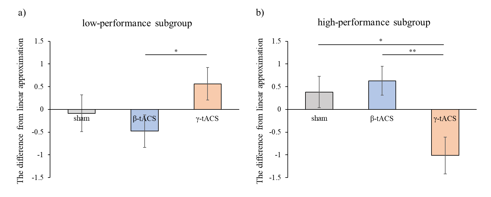 ④ またベースライン成績に応じて32名の被験者を低成績群と高成績群の各16名に分けて行ったサブグループ解析の結果,低成績群では,γ-tACS条件における成績変化量の平均値は,β-tACS条件よりも有意に大きい値となり(p = 0.048),高成績群では,γ-tACS条件よりもβ-tACS条件(p = 0.002)および疑似刺激条件(p = 0.014)において有意に大きい値となりました.これらの結果から,SMAに対するtACSの効果は,刺激頻度と被験者のパフォーマンスレベルに依存しており,ベースラインの運動成績が高い被験者にはβ帯域の刺激が有効であり,反対にベースラインの運動成績が低い被験者にはγ帯域の刺激が有効であることが示唆されました.またこの結果には,SMAに対するtACSによって,運動計画の維持および更新が変調されたことが関係している可能性が考えられました.