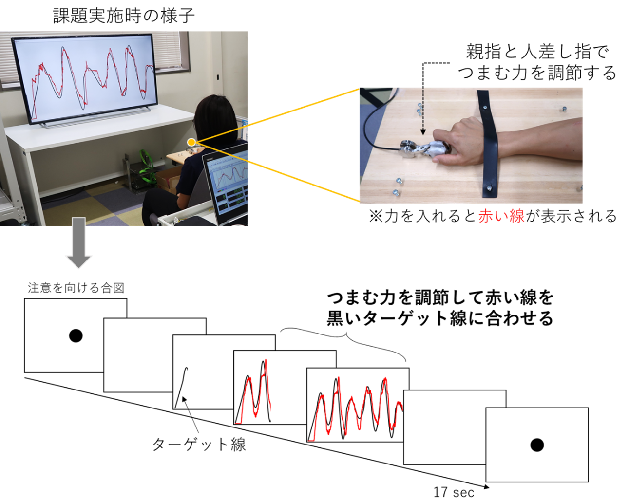 専用器具(写真右上)を親指と人差し指でつまむと、赤い線が画面上に表示されます.赤い線は、力を入れると上に移動し、力を弱めると下に移動します.つまむ力を調節して、画面左から移動していく黒いターゲット線に赤い線を合わせていきます.合計で100回行い、黒い線と赤い線のズレを評価しました.