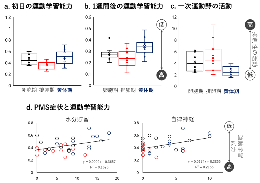 d)PMSと運動学習能力の関係性をみると、PMSの症状が大きい人ほど、運動学習能力が低下しました.