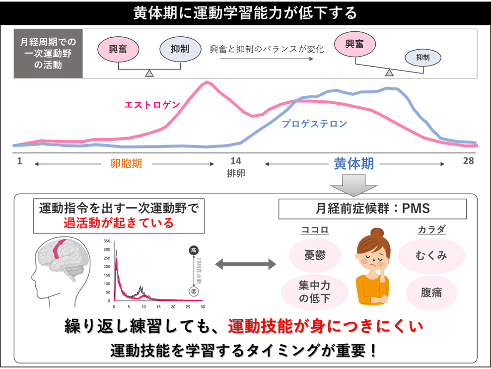 私たちの研究グループでは、「月経を女性の味方にする」ことをテーマに、研究を進めてきました.今回の実験では、運動を繰り返し行うことで習得する技能のレベル(運動学習能力)が、月経周期の一つである黄体期に低下したことから、女性が運動技能を習得するには、「学習(練習)するタイミング」が重要であることが分かりました.