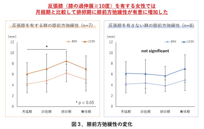 2.反張膝(膝関節の過伸展)を有する女性のみにおいて、排卵期に膝関節の弛緩性が増加することが明らかになりました。しかし、全身関節弛緩性は月経周期によって変化しませんでした。