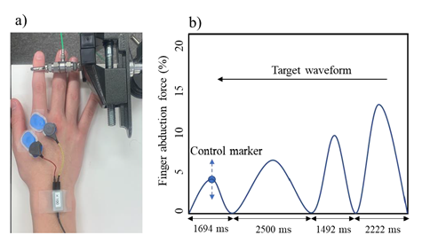 本研究には, 40名の被験者が参加した.各被験者は,右示指内外転の他動運動 を 5 Hz の頻度で 10 分間介入した後に運動学習課題を遂行する条件(他動運動条件)と他動運動を介入せずに運動学習課題を遂行する条件(Control条件)に20名ずつ振り分けられた.運動学習課題には右示指の視覚追従課題を用いた.