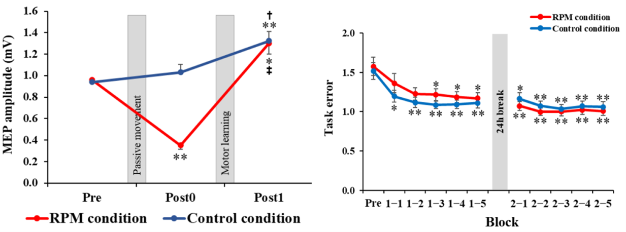 他動運動条件では,他動運動介入後 に皮質脊髄路の興奮性が一過性に低下したものの,運動練習後には Control 条件と同程度まで増大した.また他動運動介入直後の運動学習能力は低下するものの,最終的には Control 条件と同程度まで運動成績が向上した.