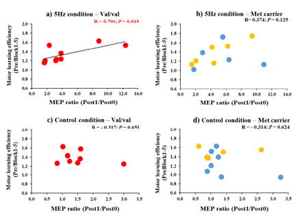 RPM condition での Val / Val 型のみ,運動練習後の MEP 変化と運動学習率の間に有意な相関関係が認められた(r = 0.735; P = 0.043).これらの結果は,RPM conditionのVal/Val 型では,運動練習によってエラー が低下した人ほど皮質脊髄路の興奮性が増大したことを示している.