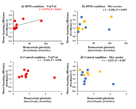 RPM Conditionでの Val / Val型のみ, Homeostatic plasticityと運動学習能力の有意 な相関関係が認められた(r = 0.579; P = 0.013).これらの結果は, Val/Val型の被験者では,RPM conditionにおいてHomeostatic plasticity 様の可塑的な変化が生じた人ほど運動学習率が高まったことを示唆している.