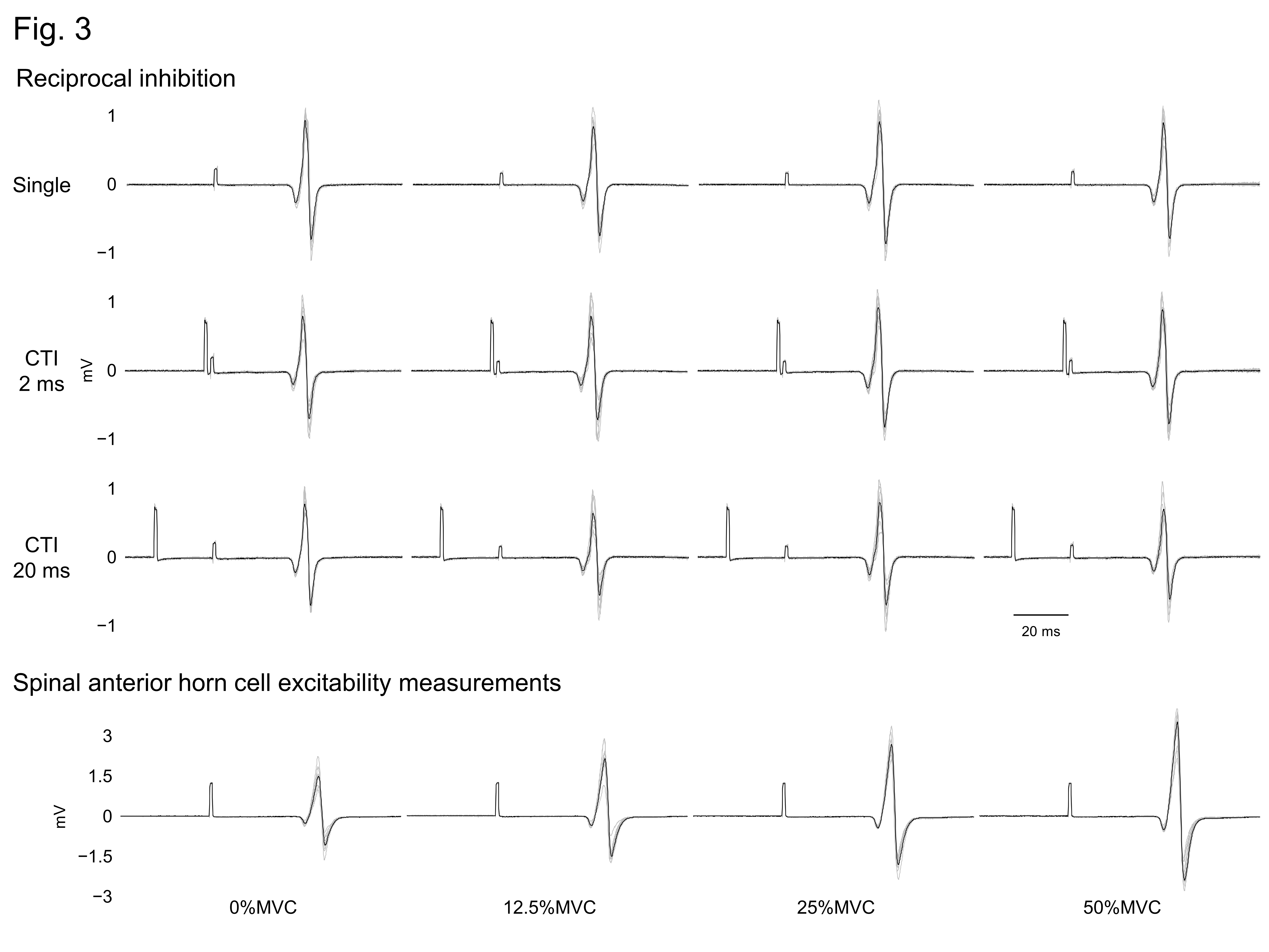脊髄相反性抑制のIa相反抑制(CTI 2 ms)とD1抑制(CTI 20 ms)では咬合強度が増加するにつれてsingle(単発刺激)と比較して振幅が増大していることから相反性抑制が減少していることが明らかとなりました.下段の脊髄興奮性は咬合強度が増加するにつれて振幅が増大していることから興奮性が増大していることが明らかとなりました.