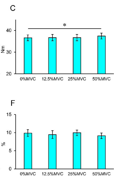 Fig. C:足関節背屈トルク,Fig. F: 筋活動比率(ヒラメ筋/前脛骨筋)