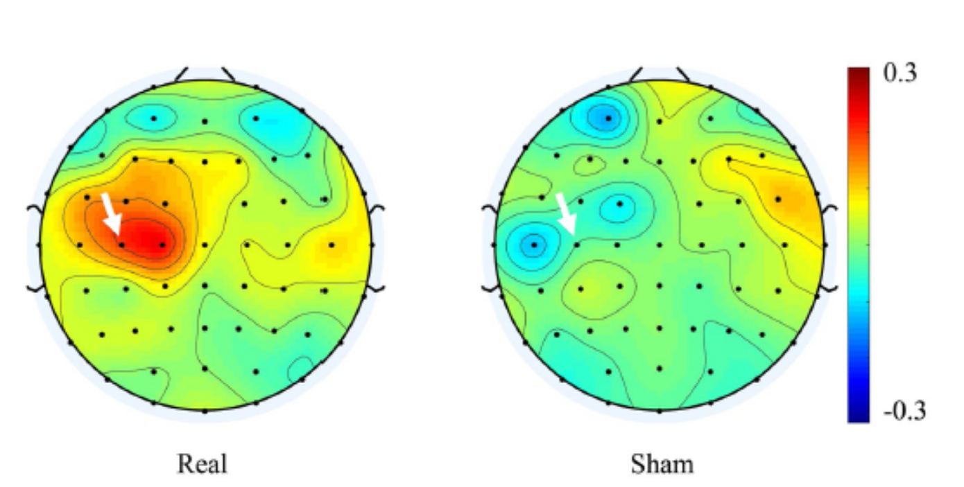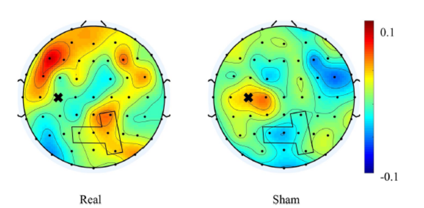 磁石直下(✕)からのつながりのうちθ領域の部分が、実際の刺激(Real)で頭頂部正中(黒線で囲まれた領域)において増大しました.