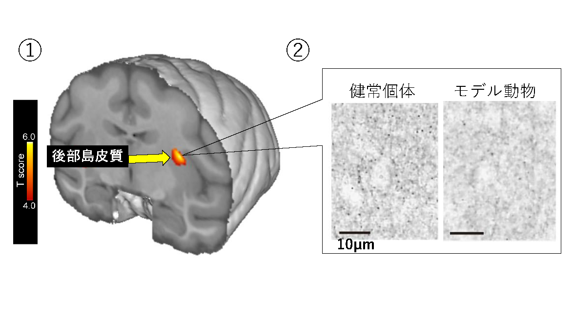 ・同定された容積縮小領域では神経細胞のシナプス減少が生じていることを証明(図②;モデル動物の後部島皮質では抑制性シナプス(黒色で可視化)が減少している).