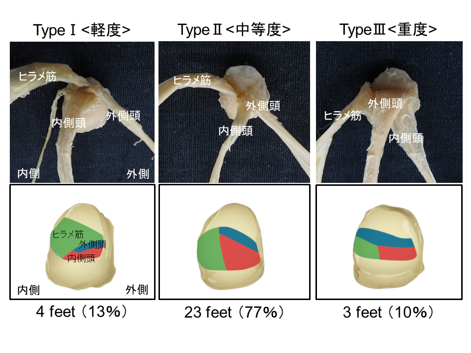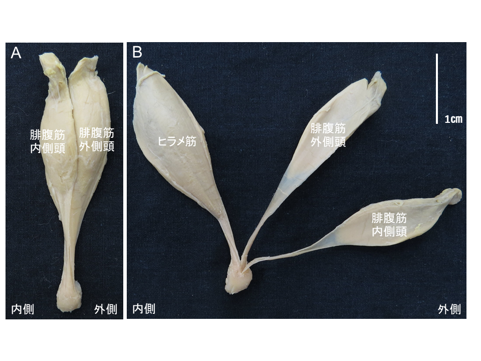 ヒトのアキレス腱は、ねじれ構造を呈していることがご遺体を用いた研究や、生体を対象としたMRIや超音波を用いた研究で明らかにされています。近年、この捻れ構造とアキレス腱障害との関係が注目されています。我々の先行研究では、重度の捻れ構造(捻れが強い)のアキレス腱は、軽度や中等度の捻れのアキレス腱よりも傷害発生のリスクが高いことが明らかとなっています。しかし,アキレス腱を用いた研究の多くが高齢のアキレス腱を対象とした研究がほとんどであり、捻れ構造や捻れの変化が先天的に構成されたものかどうかは不明でした。そこで本研究では、胎児遺体(妊娠中期)を用いてアキレス腱の捻れ構造を明らかにすることを目的に研究を行いました。その結果、胎児のアキレス腱は、高齢遺体を対象とした先行研究と類似した捻れ構造を呈していました。今回の研究結果から、アキレス腱の捻れ構造は先天的に構築された構造である可能性が高いことが明らかとなりました。従って、アキレス腱の捻れ構造は変化させることができないため、重度の捻れ構造のアキレス腱に対しては、力学的特性などの構造以外の要因にアプローチする必要があると考えられました。