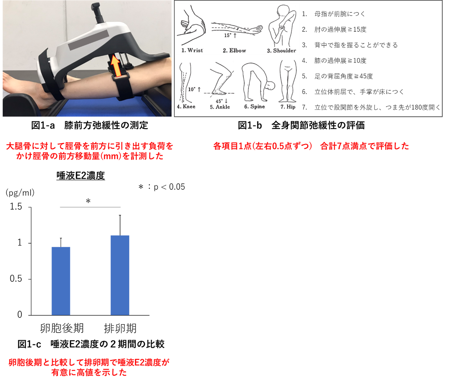 1.月経周期で変動するエストラジオール(E2)濃度が関節弛緩性へ及ぼす影響を検討しました(図1).