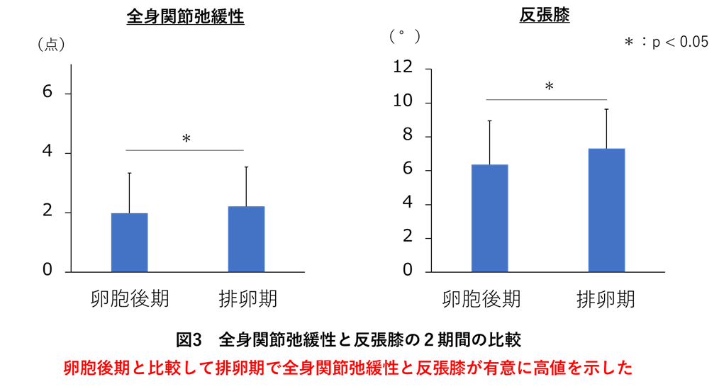 3.卵胞後期と比較して排卵期で全身関節弛緩性と反張膝が高値を示しました(図3).
