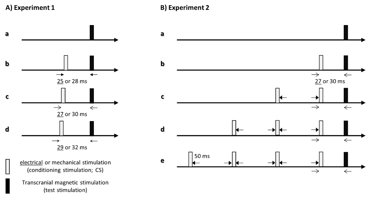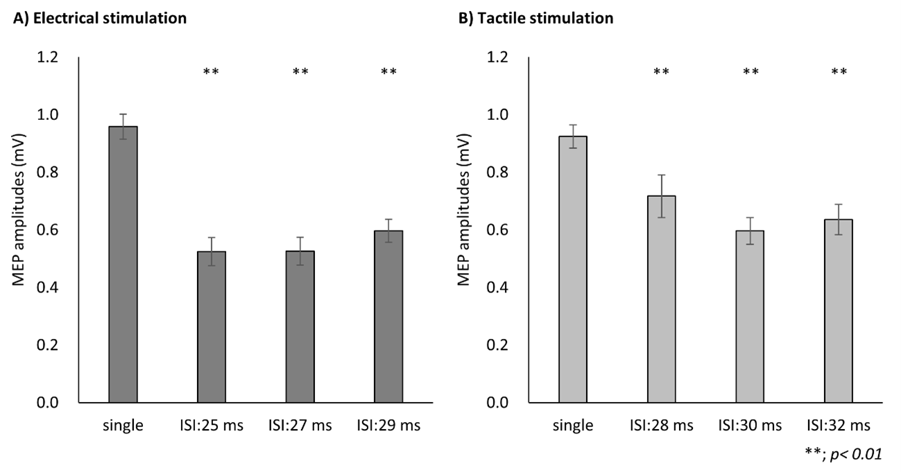 ① 19名と対象に2つの実験を行いました.A)実験1では,電気刺激または触覚刺激の刺激方法の違いが大脳皮質の反応に及ぼす影響を検討しました.B)実験2では,電気刺激または触覚刺激の連発刺激後の大脳皮質反応の違いについて検討しました.