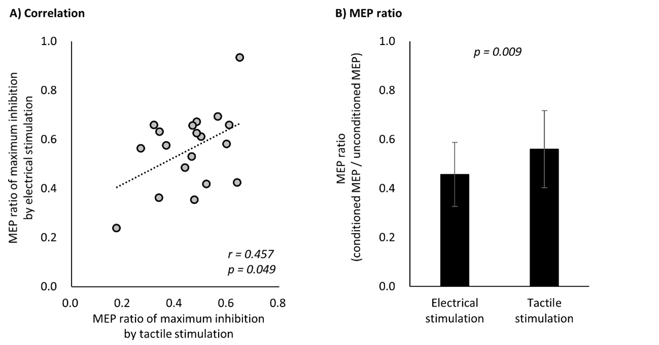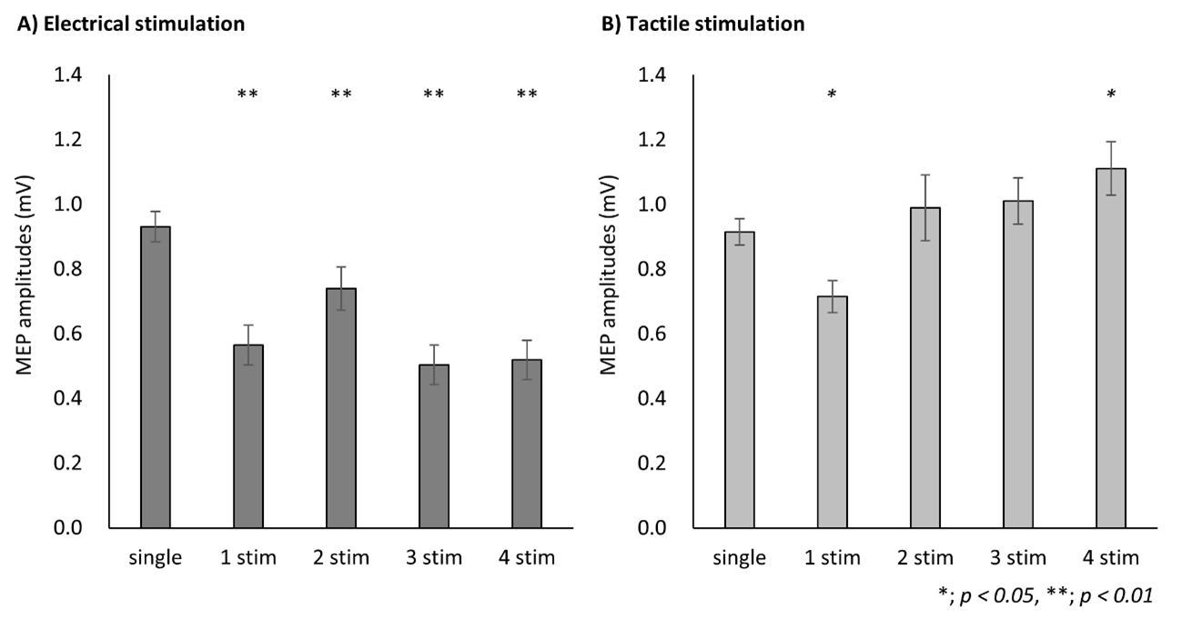 手などの末梢に対して感覚刺激を行うと,感覚機能を司る領域の脳活動が記録されます.この脳活動の直後に運動を司る領域の活動を記録すると感覚刺激がない条件に比べて,反応が小さくなることが示されています.これは,感覚を司る領域と運動を司る領域の機能連関を示していると報告されています.これまでの研究では,主に1回の電気刺激後に運動を司る領域の反応が小さくなることが報告されていますが,日常生活で多く使われる「触覚」刺激後にも同様の反応が認められるのか,連発刺激後にも同様の反応になるのかなどは明らかになっていません.そのため,本研究では,「電気刺激後」だけでなく,「触覚刺激後」または「連発刺激後」においても同様の反応が認められるのか否かについて検討を行いました.その結果,「触覚刺激後」においても同様の皮質反応が認められた一方,「連発刺激後」の反応は,電気刺激時と触覚刺激時で異なる反応が認められました.よって,「電気刺激」と「触覚刺激」後の運動を司る領域の反応は異なる可能性が示唆されました.