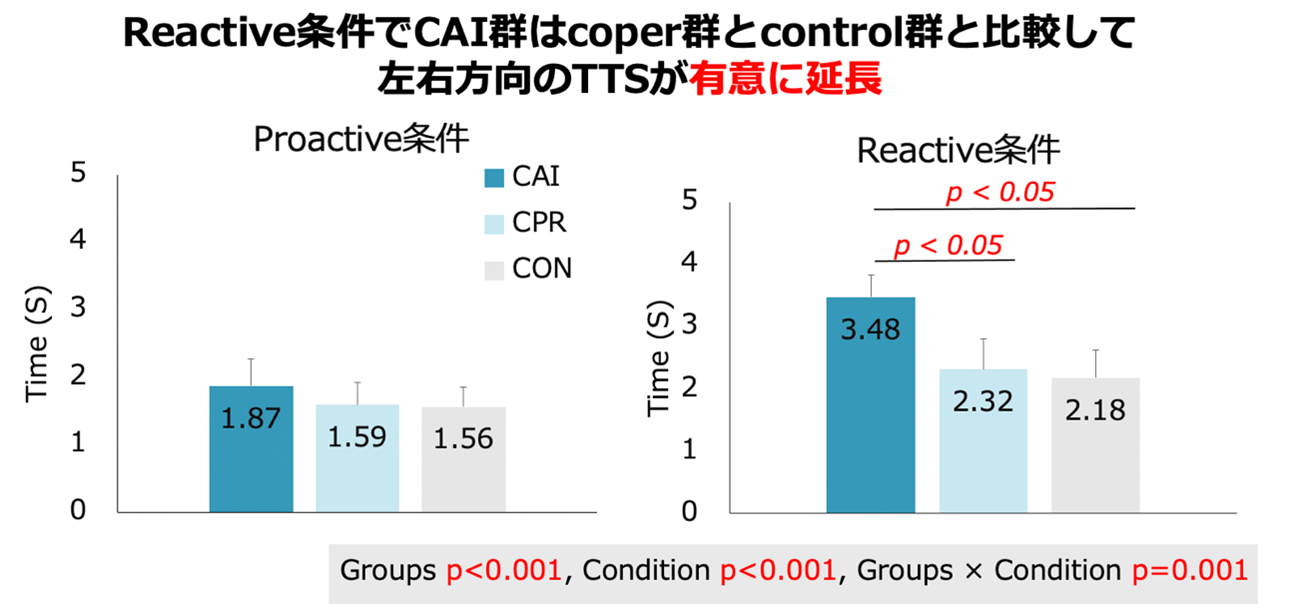 その結果、coper群は着地条件にかかわらず、前後方向のTTSが増加することが明らかとなりました。また、Reactive条件でCAI群はcoper群と比較して左右方向のTTSが増加することが明らかとなりました.よって、coper群はCAI群とは異なる姿勢制御を行っていることが示唆されました。