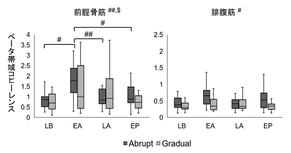 若年健常者を対象にトレッドミル歩行中に右足部を後方に牽引する歩行適応課題を2条件実施しました。歩行適応開始時(EA)に外力が急に加わる環境(Abrupt条件)では右側の前脛骨筋におけるコヒーレンスが増大し、歩行適応が進むにつれて(EAからLAへ)減少する一方、外力が徐々に加わる環境(Gradual条件)では右側の前脛骨筋におけるコヒーレンスにはバラツキはあるものの有意な変化が見られませんでした。