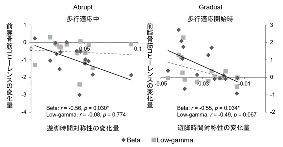 また、Abrupt条件では歩行適応開始時にコヒーレンスが増加した後に減少する変化量が歩行適応中の遊脚時間対称性の変化量と相関し、Gradual条件では歩行適応開始時にコヒーレンスが増加した者ほど遊脚時間が非対称的となる相関関係が確認されました。
