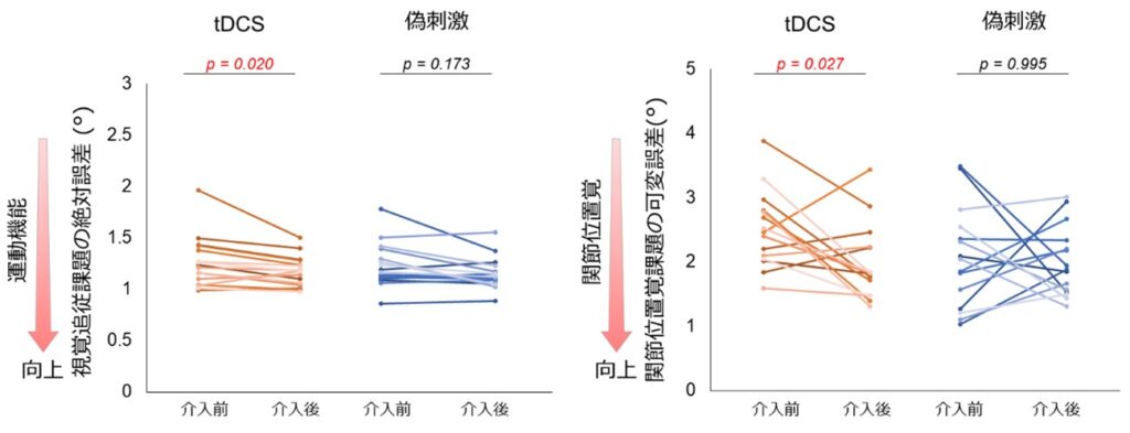 ②後頭頂葉へのtDCS介入後において、視覚追従課題および関節位置覚課題成績が向上した。