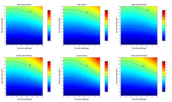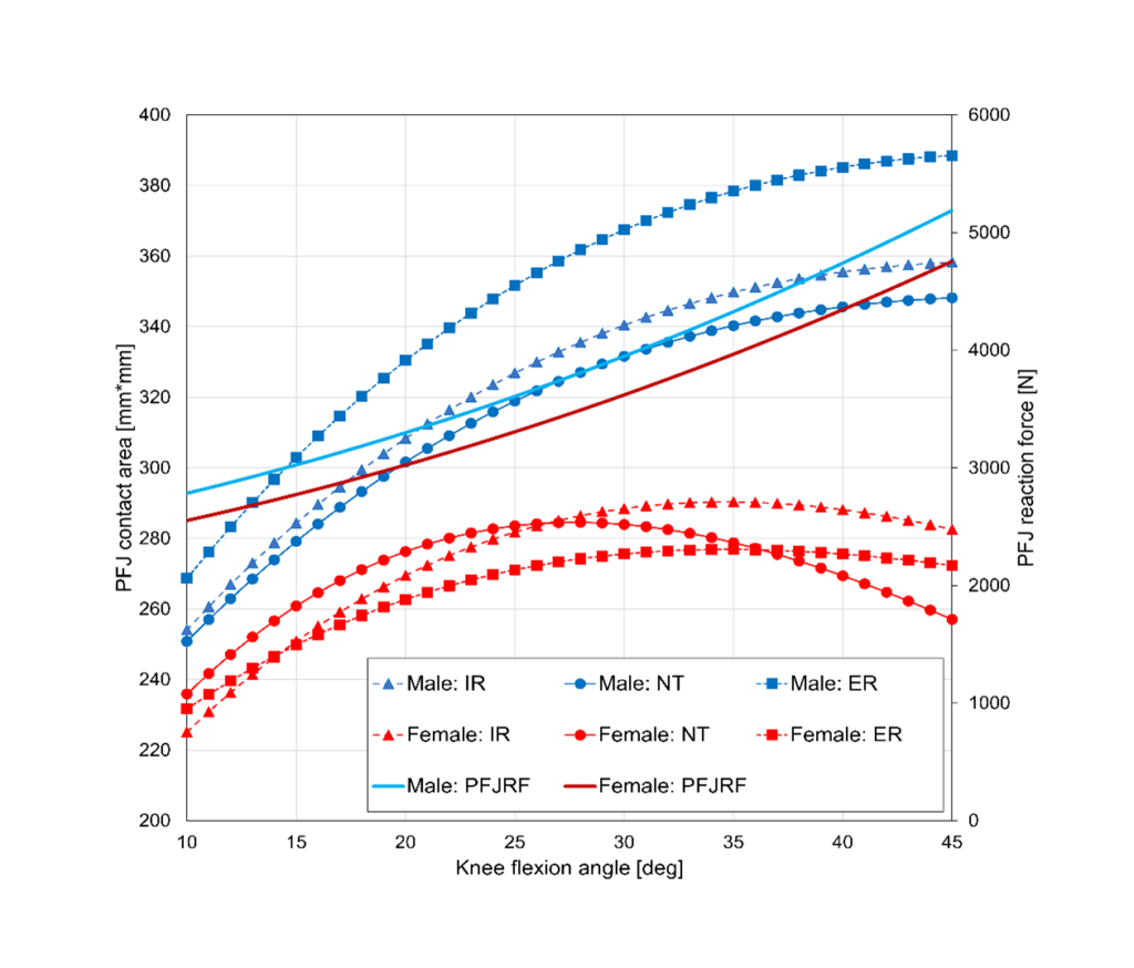 本研究は数理モデルを用いたシミュレーション研究にて,性差と膝関節回旋肢位が膝蓋大腿関節ストレスに与える影響を検証しました.その結果,女性は男性と比較して,どの回旋肢位においても膝蓋大腿関節ストレスが高いことを明らかにしました. 本研究成果は国際誌「Acta of Bioengineering and Biomechanics」に掲載予定です.