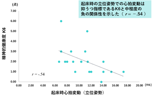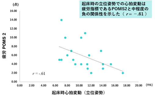 抑うつ指標として用いられるK6とPOMS2で評価した疲労感は,起床時立位姿勢で計測された心拍変動と中程度 (相関係数rが0.3〜0.7,もしくは-0.3~-0.7) の負の関係性が見られました.起床時立位心拍変動は,抑うつや疲労感といったメンタルヘルス指標と関連し,アスリートのメンタルヘルス低下を予測するバイオマーカーとなりうることが示唆されました.