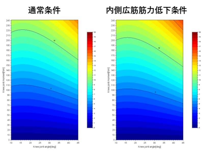 そこで,本研究は数理モデルを用いたシミュレーション研究にて,内側広筋の筋力と膝蓋大腿関節ストレスの関係性を検証しました.内側広筋の筋力低下を惹起させた条件では,膝蓋大腿関節ストレスが高まることが明らかになりました. 本研究成果は国際誌「Acta of Bioengineering and Biomechanics」に掲載予定です.
