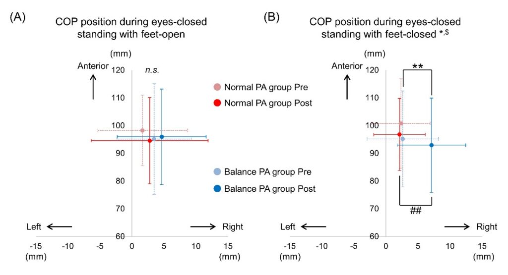 通常の立位でプリズム適応を行うと閉眼静止立位時の足圧中心位置に有意な変位は生じないが,バランスディスク上でプリズム適応を行うと閉眼閉脚静止立位時の足圧中心位置が有意に右に変位していた.この変位は開脚立位では生じず(A),姿勢制御の難易度が高くなる閉脚立位でのみ生じていた(B).