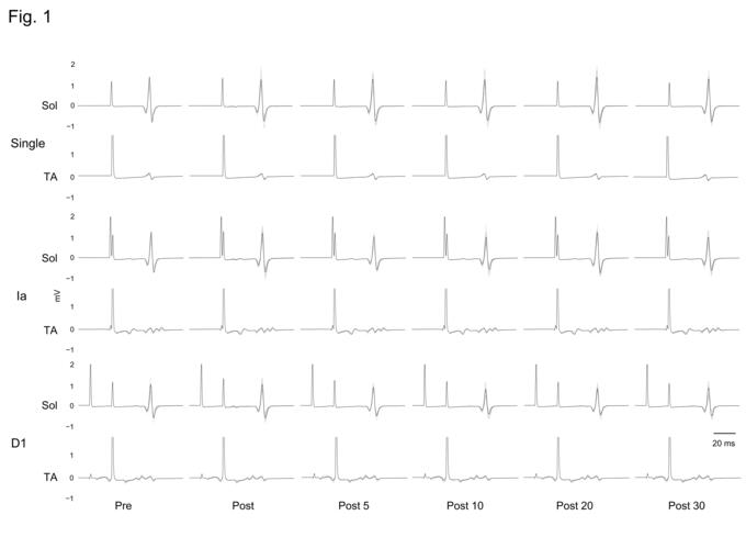 図1:各刺激条件の生波形を示し,Singleが単発刺激,IaがIa相反抑制であり,D1がD1抑制を示します.介入対象に注意を向けた相反性抑制増強法は,介入後30分間まで抑制が増強しました.