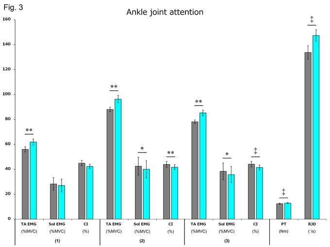 図3:反復他動運動+足関節注視条件での足関節の運動機能を計測した結果を示す.グレーが介入前,青が介入後を示し,筋活動,筋力,関節運動発揮率で向上を示した.