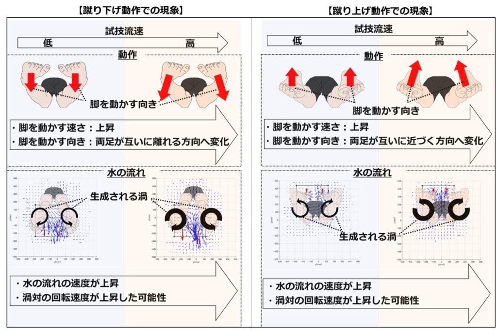 その結果,水中ドルフィンキックの下肢動作において,泳ぐスピードが上がるにつれて水の流れの速度が増大し,キック中により強い渦が生成され,推進力が増加する要因となっている可能性が示されました(図1).