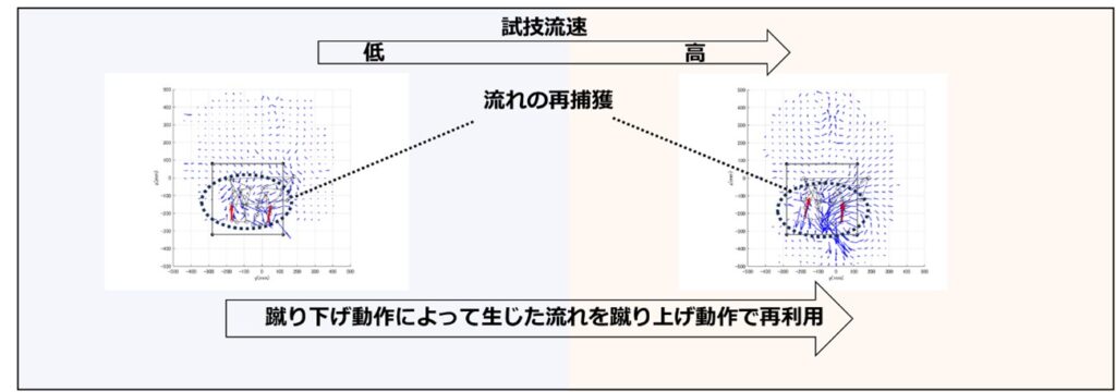また,蹴り下ろし動作から蹴り上げ動作に移行する局面で,蹴り下ろしで生成された流れを再利用する現象が観察され,この現象は泳ぐスピードが上がるにつれて顕著になりました(図2).