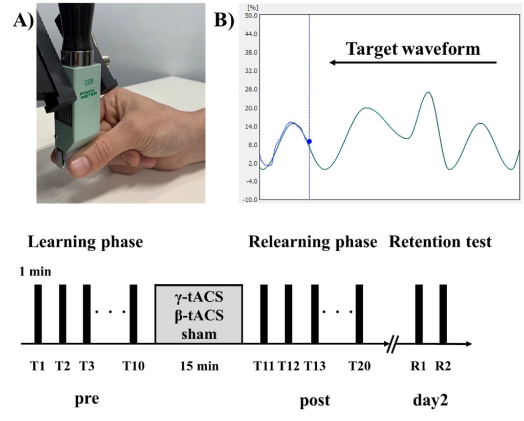 ヒトが新たな運動技能を習得するには運動学習と呼ばれる過程が必要不可欠です.経頭蓋交流電流刺激は,運動学習を向上させる刺激方法として注目されています.運動学習に関与する脳領域として一次運動野や小脳,補足運動野などが挙げられます.これまで,一次運動野や小脳に対する経頭蓋交流電流刺激は運動学習を向上させることが報告されています.しかしながら,補足運動野への経頭蓋交流電流刺激が運動学習に与える効果は明らかにされていませんでした.本研究では,補足運動野への経頭蓋交流電流刺激が運動学習に与える効果を検証しました.本研究の結果,補足運動野へのγ帯域の経頭蓋交流電流刺激は,ベースライン成績が低く,刺激前の学習率が高い被験者の刺激後の学習率を促進させることが明らかとなりました.本研究成果は,国際誌『Frontiers In Behavioral Neuroscience』に掲載予定です.