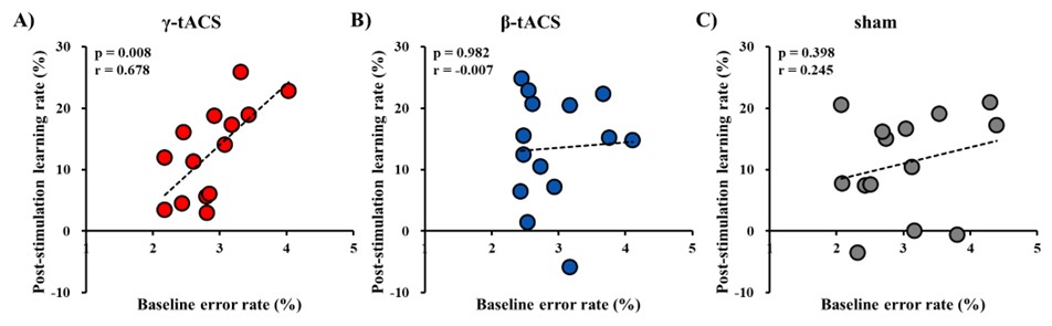 2. γ帯域の経頭蓋交流電流刺激はベースライン成績が低い被験者ほど,刺激後の学習率が高くなる関係性が認められました.