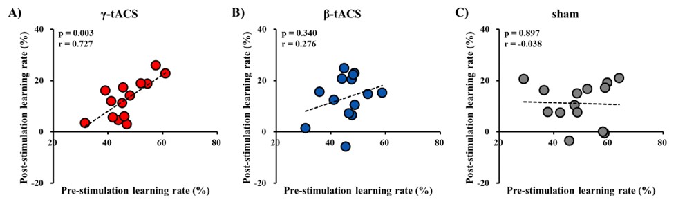 3. さらにγ帯域の経頭蓋交流電流刺激は刺激前の学習率が高い被験者ほど,刺激後の学習率が高くなる関係性が認められました.