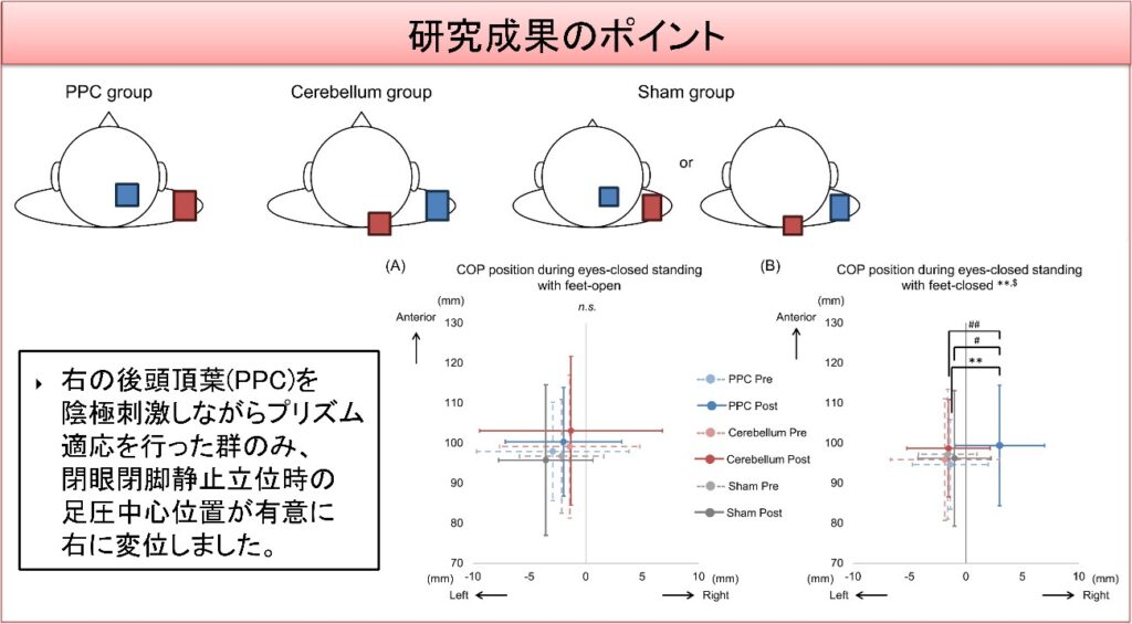 脳卒中後患者の約3割以上に半側空間無視という特異的な高次脳機能障害が残存するとされています.この半側空間無視の治療法として有名なプリズム適応には様々な課題に効果が転移することが知られていますが,プリズム適応による姿勢制御への転移効果には一貫性が乏しいことも報告されています.近年,プリズム適応の神経メカニズムに関するレビュー論文が報告され,後頭頂葉や小脳の活動が大きく関与していることが明らかにされています.そこで,本研究ではプリズム適応にこれらの脳部位に対する非侵襲的脳刺激法を併用して姿勢制御への転移効果に影響を与える神経メカニズムを検討しました. 本研究の結果,経頭蓋直流電気刺激を用いて右の後頭頂葉を陰極刺激しながらプリズム適応を行うと閉眼閉脚静止立位時の足圧中心位置が有意に右に変位しました.プリズム適応に重要とされる視覚や固有受容感覚だけでなく,姿勢制御に重要な体性感覚や前庭感覚などの多種の感覚情報を統合する後頭頂葉の活動が姿勢制御への転移効果に影響を与えることが示唆されました.