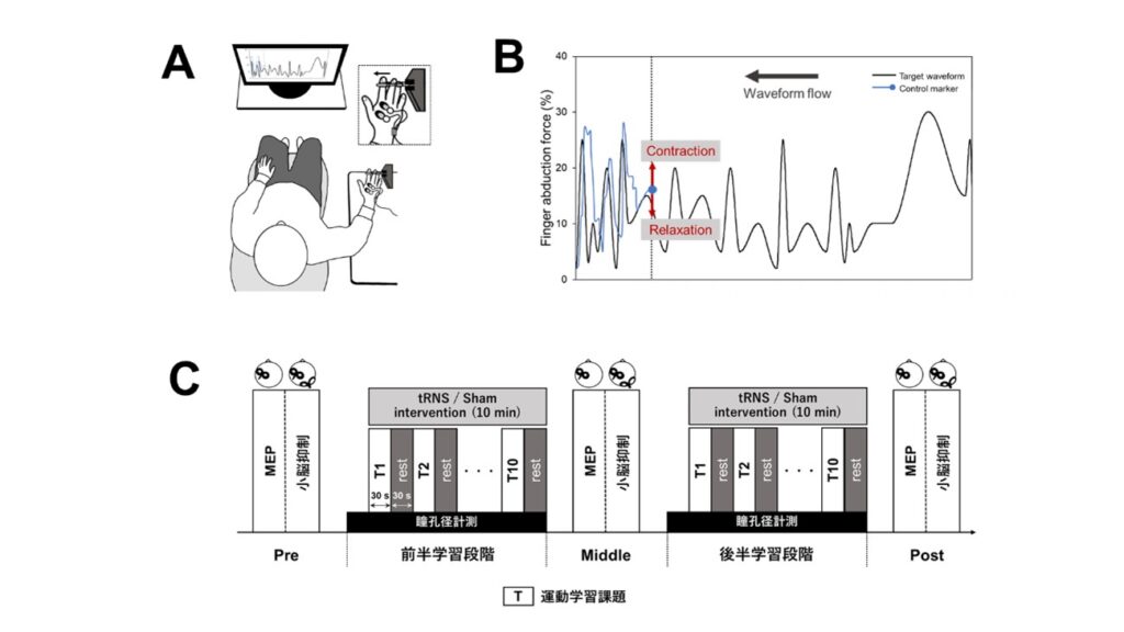 ①運動学習には視覚追従課題を用い(A,B),被験者は小脳へのtRNSまたは偽刺激を受けながら運動学習課題を実施しました(C).脳活動変化,運動学習率,瞳孔径変化を2群間で比較しました.