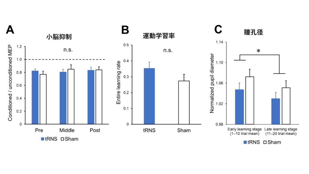 本研究より,小脳へのtRNSは小脳抑制の減弱をもたらすことができず,運動学習や瞳孔径にも影響を与えないことが示されました.この結果には,小脳構造の複雑さや,被験者間の効果のバラつきが影響している可能性があり,小脳やtRNS手法の課題を示す重要な知見となりました.今後は,運動学習を促進させる非侵襲的脳刺激法の確立に向けて,刺激部位や刺激設定等を追及していく必要があります.