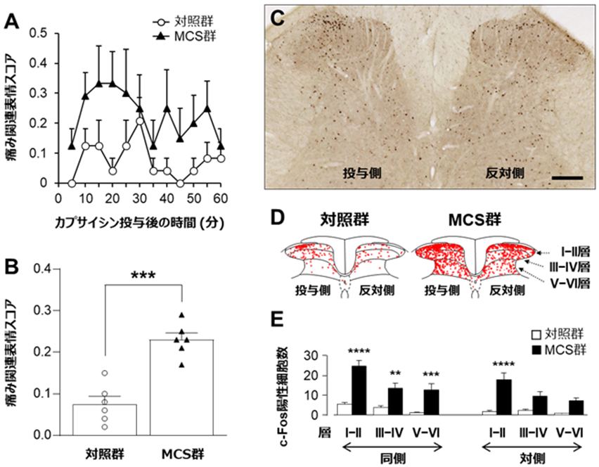 慢性筋痛の発症・増悪には,持続的なストレスが強く関与すると考えられていますが,その詳細な神経メカニズムはよく知られていません.本研究では,肉体的および精神的要素を含む複合持続ストレス(MCS)を負荷したモデルラットの筋に対して痛覚神経を活性化するカプサイシンを投与したところ,痛み関連表情スコアが上昇しました(図A, B).また,カプサイシン筋注により,神経活性化の指標であるc-Fos陽性細胞の発現が,MCSモデルラットの脊髄後角において広範囲にわたり増加しました(図C~E).一方,MCSモデルラットの筋痛覚神経応答には変化がみられませんでした.これらの結果より,MCS誘発性の筋痛には,末梢ではなく,脊髄ニューロンの興奮性増大が関与することがわかりました.