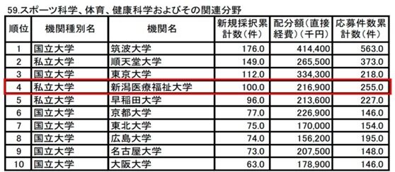 2023年1月、令和4年度(2022年度)科学研究費の配分について文部科学省から公表されました。その中で、新潟医療福祉大学(新潟県新潟市、学長:西澤 正豊)は、「スポーツ科学、体育、健康科学、およびその関連分野」において、2022年度は、新規採択累計数が100件となり、全国第4位(私立大学2位)となりました。トップ10に入った大学は全て首都圏大学もしくは国立大学で、創立100年以上の歴史を持つ中、地方の本学が上位にランクインすることができました。