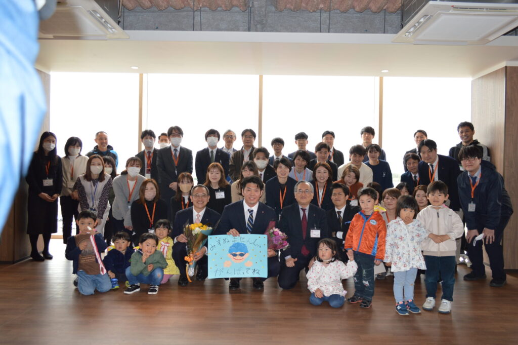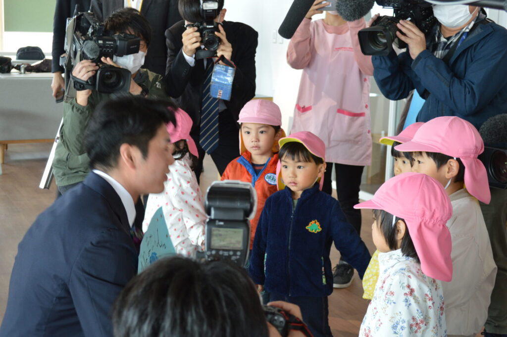 報告会前には教職員ら約60名によるお出迎えのほか、本学附属インターナショナルこども園の園児から似顔絵もプレゼントされました。