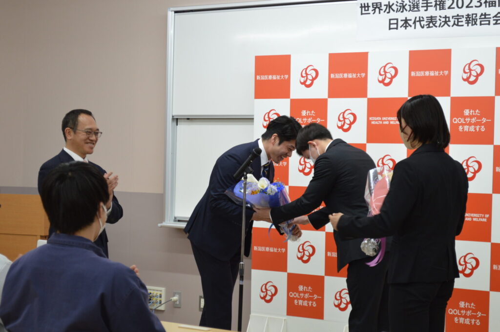 4月17日(月)に、本学の第11研究・実習棟(U棟)にて、水沼尚輝選手の「第99回日本選手権・世界水泳選手権内定報告会」を実施しました。
