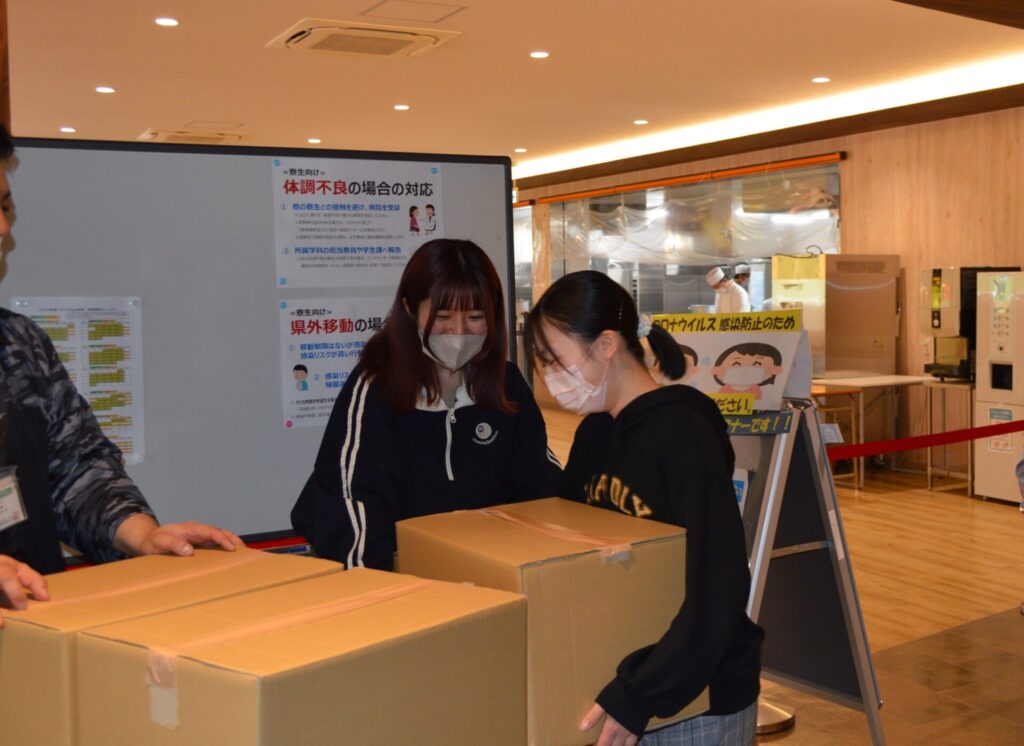 届いたおよそ1トンの食料は本学の職員から寮生・留学生に配付されました。