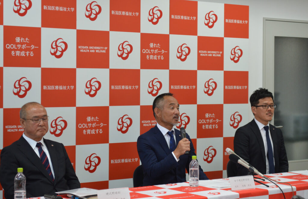 監督に就任する後藤桂太先生(健康スポーツ学科准教授/写真中央)、硬式野球部総監督の佐藤和也先生(健康スポーツ学科教授/写真左)が登壇し、
