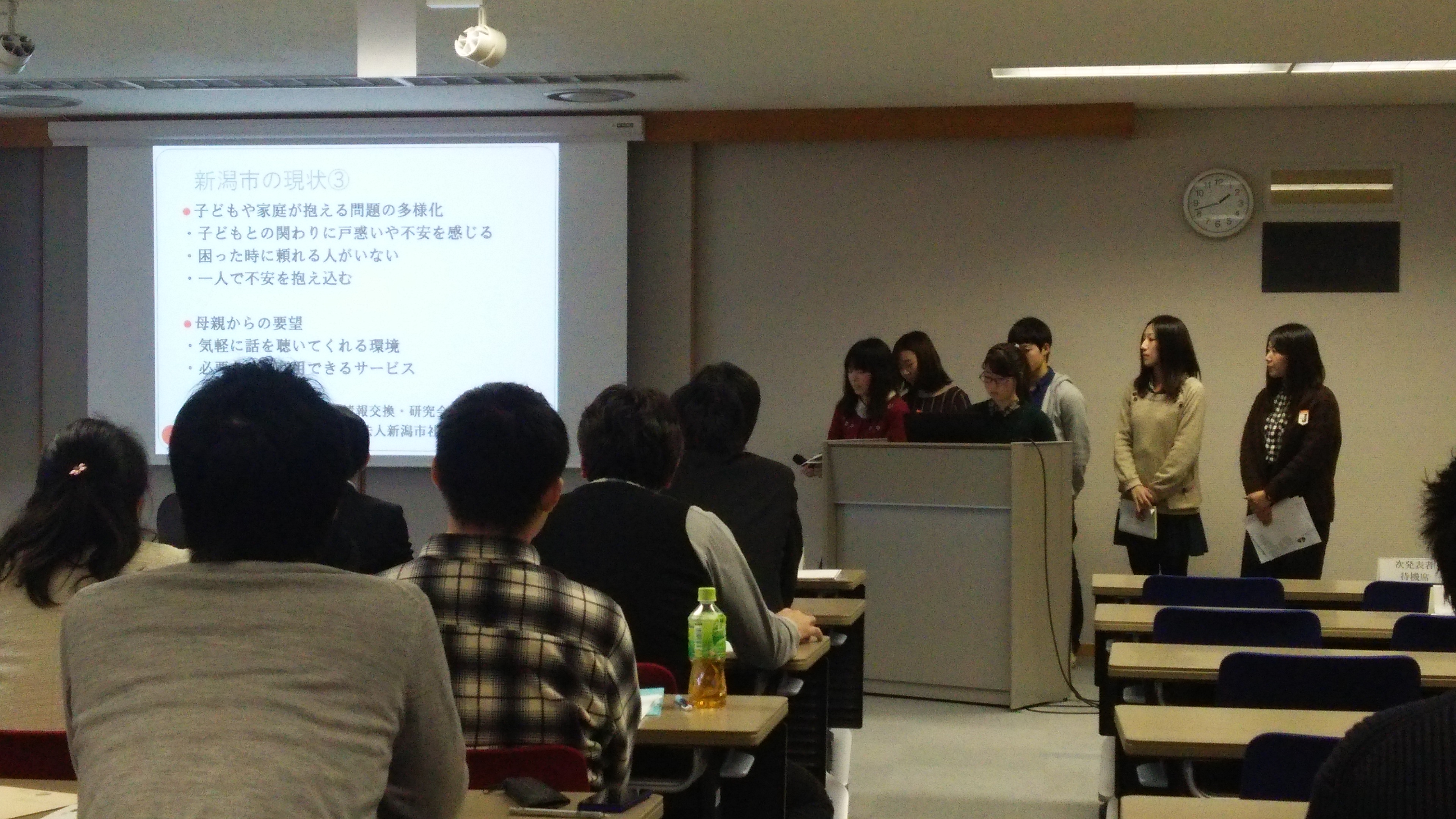 11月29日(土)に、大学連携新潟協議会と新潟市主催による「学生政策提案フォーラム」が新潟国際情報大学・新潟中央キャンパスにて行われ、本学社会福祉学科の学生6人が提案した「子育てしやすいまちづくり」が最優秀賞に輝きました。
