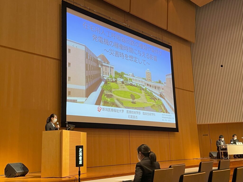 石黒さんは髙橋 良光准教授らの研究グループに所属しており、在宅用人工呼吸器回路の種類や条件が発電機の稼働時間に与える影響~災害時を想定して~というテーマで発表しました。