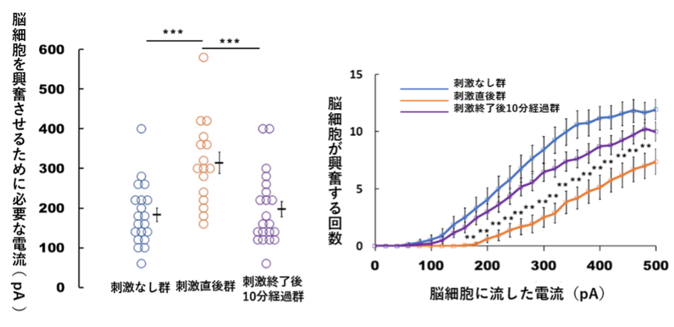 【方法】生後21-27日のマウスからとった脳の一部を、磁石を用い300mTの強さで30分間刺激しました。刺激した後の脳細胞の興奮性を、パッチクランプ法(細いガラス管を1個の細胞の膜に密着させて細胞の電気信号を測り、その細胞がどれだけ興奮しているかを調べる方法)を用いて刺激をしていない脳細胞と比較しました。